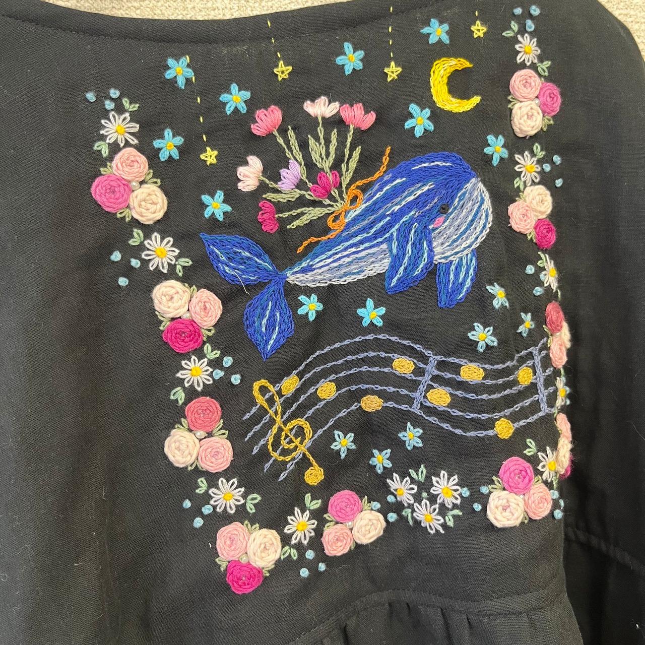 優雅に游ぐクジラさんの刺繍は、額に入れて飾っておきたい素晴らしさ